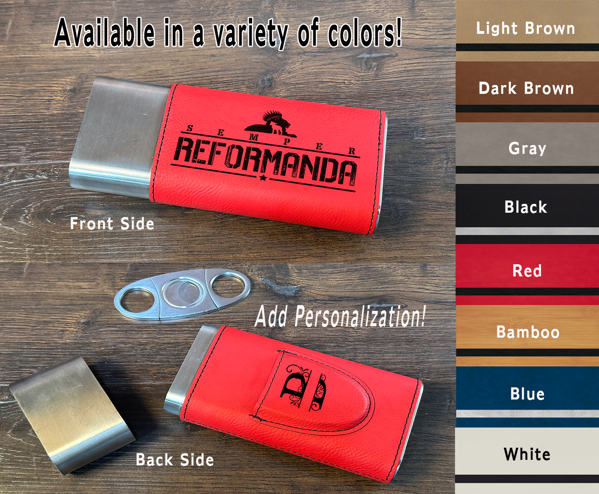 Keep your treasured cigars safe while you travel with this beautiful stainless steel and vegan leather cigar case. Stainless steel construction provides the necessary protection while the vegan leather wrapping makes this one attractive case that is sure to draw attention. Each case comes with one razor sharp stainless steel guillotine cutter with convenient onboard storage.